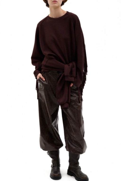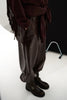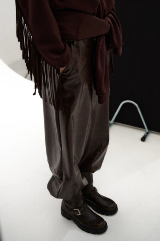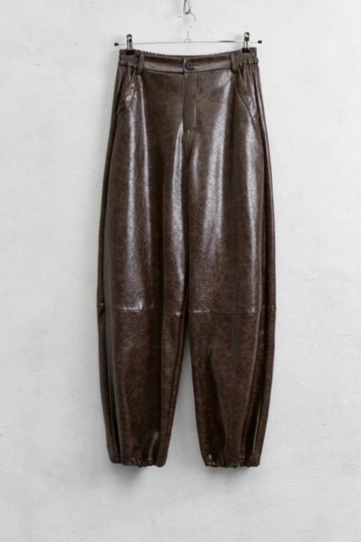 These faux leather trousers are cut in a relaxed, baggy fit with a soft feel and a rich brown tone. Designed with an elasticated back for comfort, a button-front detail, and adjustable drawstrings at the ankles so you can wear them loose or cinched.