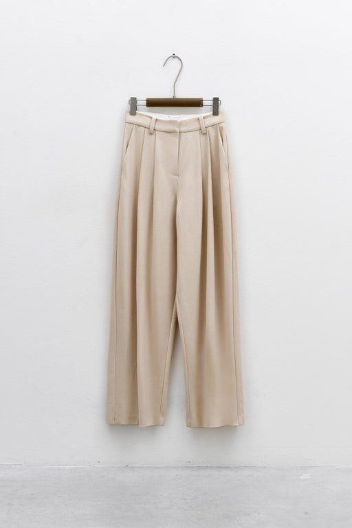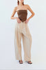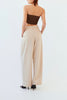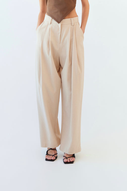 Elevate your wardrobe with these high waisted, wide leg trousers in a soft cream colour. Featuring elegant front pleats, they create a flattering, tailored silhouette that moves effortlessly from day to night. Pair them with an oversized shirt for a sophisticated office-ready look or style with a minimalist knit for a relaxed modern vibe. Featuring side and back pockets.